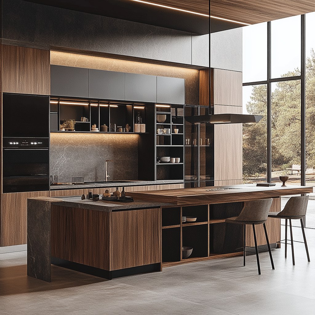 4. Функциональность и эргономика: Продумайте расположение мебели и техники, чтобы кухня была удобной и функциональной. Учитывайте «рабочий треугольник»: плита, мойка, холодильник. Оптимальное расстояние между ними обеспечит комфортное приготовление пищи. Выберите подходящую фурнитуру: выдвижные ящики, системы хранения, подъемные механизмы.